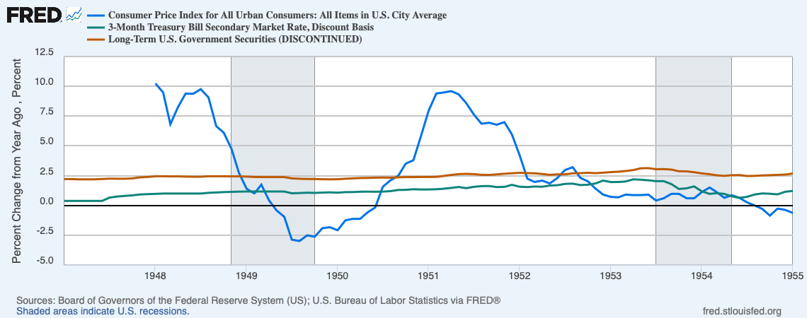 The Fed pegged long term interest rates at 2.5% during WWII, to hold down interest costs and keep up the prices at which the government sold debt. Inflation surged in 1947 and 1948 when price controls were lifted, but inflation quickly came down again once the price level had caught up. The Fed already wanted to raise rates in the recovery of 1950. The resurgence of inflation during the Korean War in 1951 set the stage for the great battle for independence: Would the Fed continue to peg at 2.5%, printing money to buy bonds as needed? Or should the Fed’s job to contain inflation take precedence? (More technically, the Fed exchanged bonds for bank reserves, accounts banks hold at the Fed, which are freely transferrable to cash and before 2008 did not pay any interest.)
