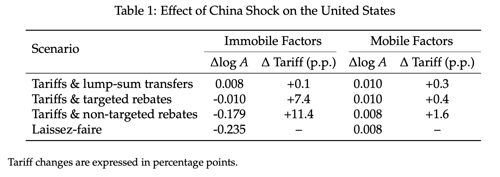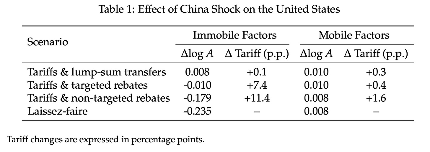 Let me say something about something I know about: "With “tariffs and lump-sum transfers”, China becoming more productive is a benefit to the US (0.008). With “Laissez-faire,” no transfers and tariffs, it is bad for the US (-0.235)"