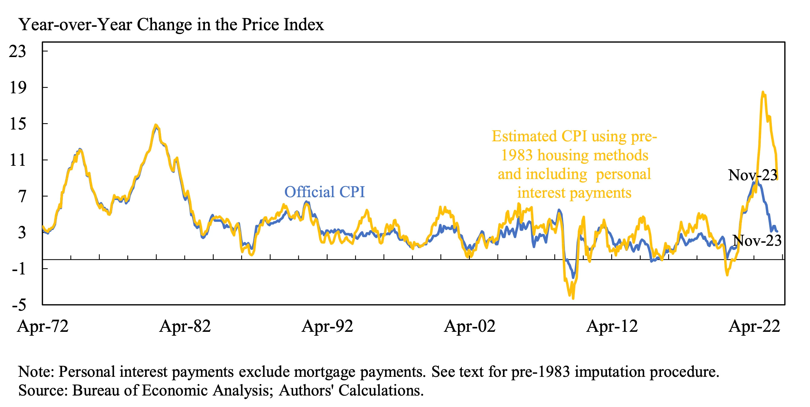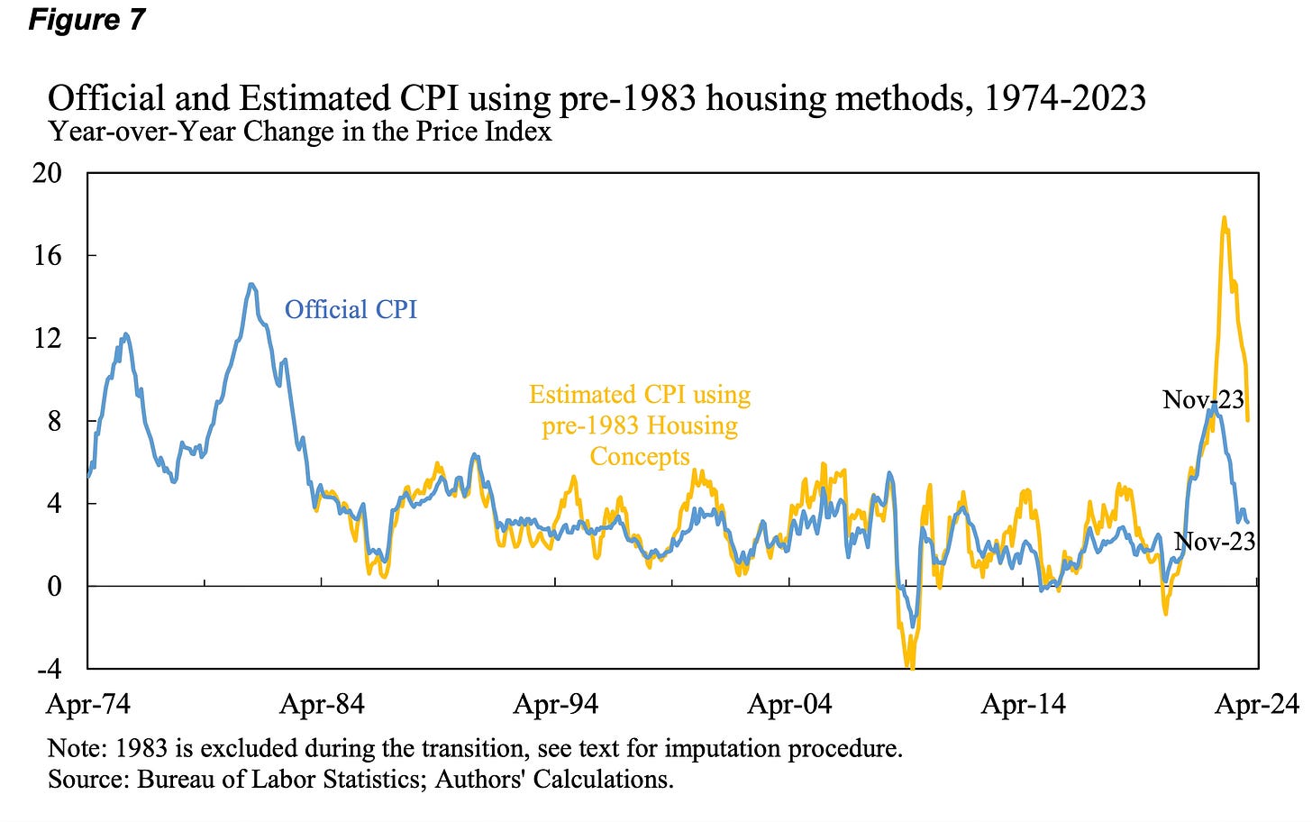 The main difference is that the old measure counts the price and interest rate you have to pay to buy a new house as the cost of the house, while the new measure is based on what it costs to rent a house. You can see that the new and old methods are the same in the initial run up of inflation starting in 2021, but then the new measure shoots up when the Fed raised interest rates.