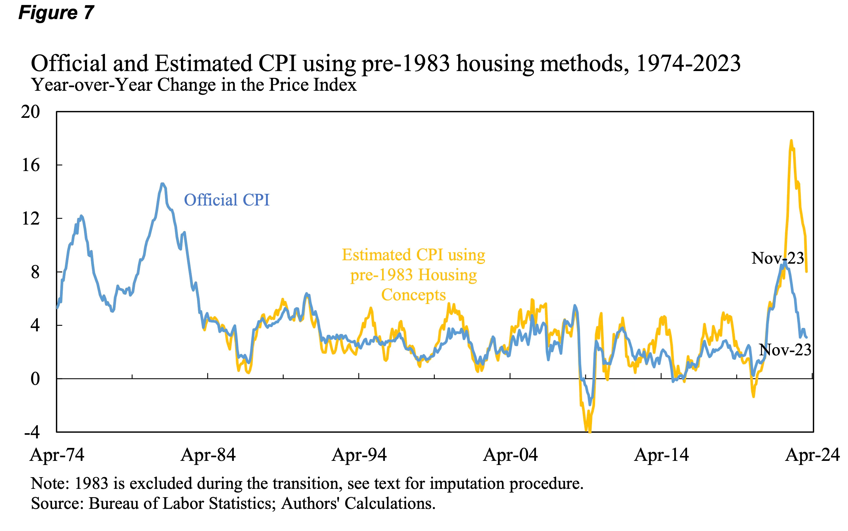 Here is the current measure of inflation along with what inflation would be if the BLS computed the cost of housing as it did before 1983: