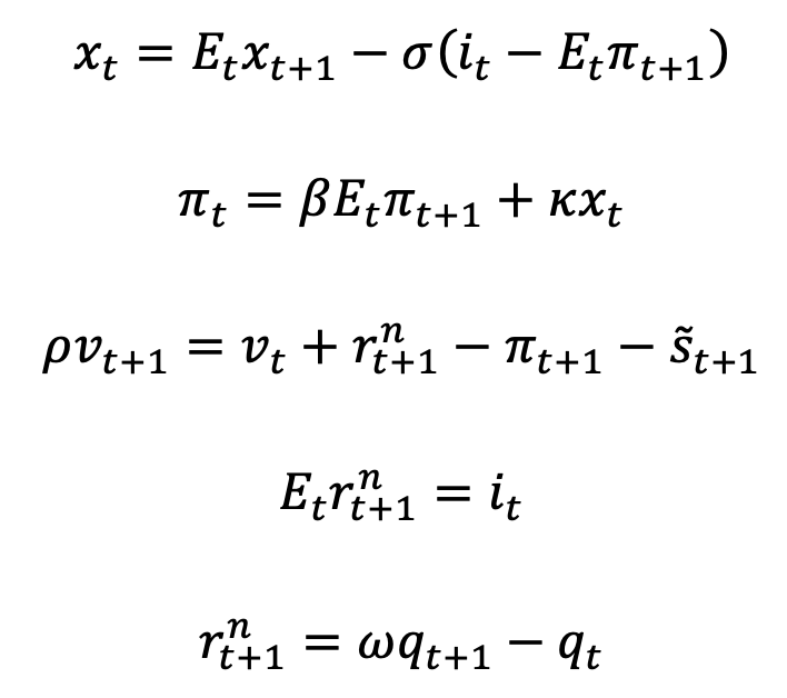 where x is the output gap, i is the nominal interest rate, 𝜋 is inflation, v is the real value of government debt, r is the nominal return on the portfolio of government bonds, s is the real primary surplus scaled by the value of debt, q is the price of government bonds, and 𝛚 describes the geometric maturity structure of government debt.)