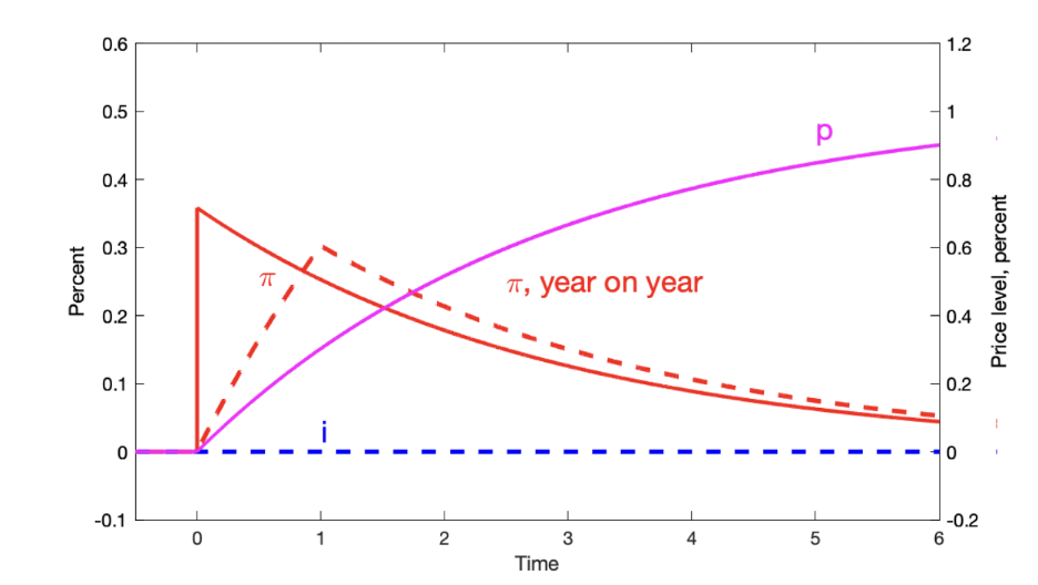 But you still have to ask: How do people get the money to afford the higher prices? Where is the nominal anchor? New Keynesian models do have a nominal anchor, either money supply or fiscal theory. In some treatments, the central bank issues more money in order to follow the interest-rate target. In others, it issues more government debt. These are hidden in footnotes. But somebody has to move the nominal anchor! A “supply” shock without movement in the nominal anchor doesn’t cause inflation. Inflation only comes from a move in that underlying nominal anchor.