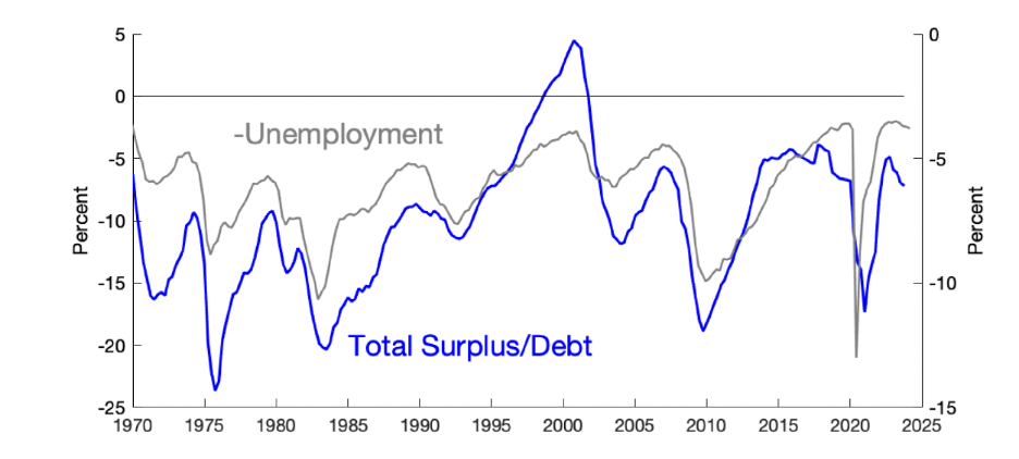 Figure 10. Total surplus divided by federal debt held by the public, and the negative of the unemployment rate.