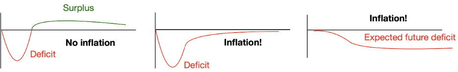 Trouble brews in the middle panel of Figure 2. Here the same debt or deficit is not matched by convincing promises of future surpluses. The present value of surpluses declines, and inflation breaks out. This is what I think happened in 2021–23.