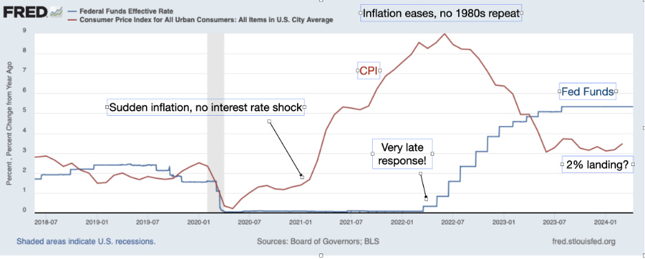 Inflation broke out suddenly in February 2021, as illustrated in Figure 1. Where did inflation come from? The Federal Reserve, remarkably, did nothing for a full year, leaving interest rates at zero. Yet inflation did not spiral upward. Inflation eased just as the Fed lifted interest rates off zero. Why did inflation ease? Standard doctrine says that interest rates must rise above inflation to push inflation down, with a big recession as in 1982. Yet inflation came down on its own despite interest rates below inflation, and with no hint of economic slowdown. As I write, inflation is still persistently above 2%. When will it finally end? Or will inflation resurge, as it did following a similar situation in 1976?
