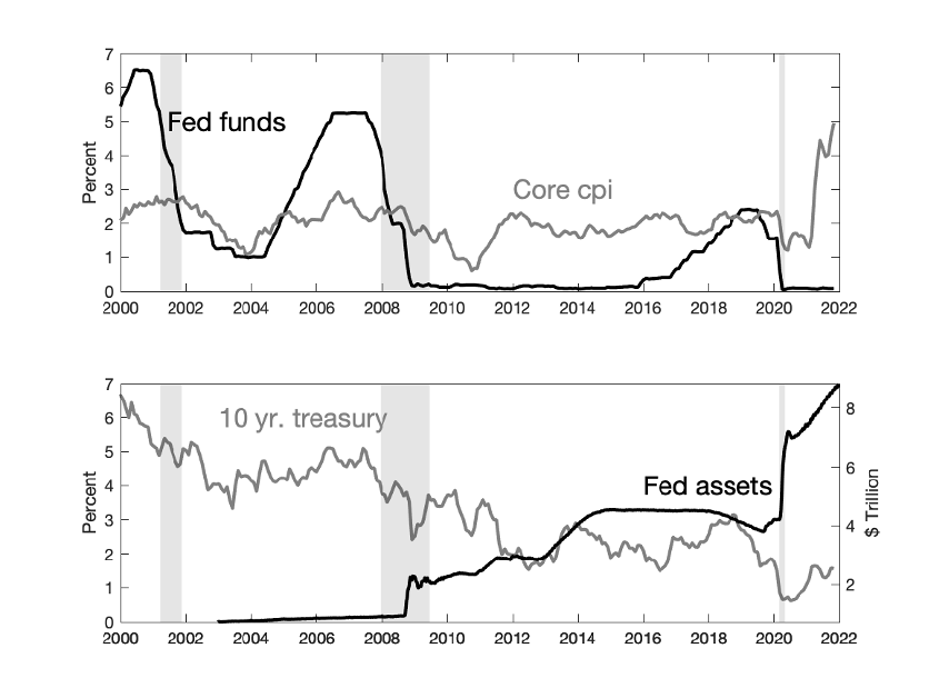 The plot answers the first puzzle of 2021: Inflation surged, even though monetary policy did nothing unusual. Why? That’s what happens in response to an unfunded fiscal expansion.