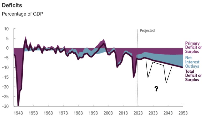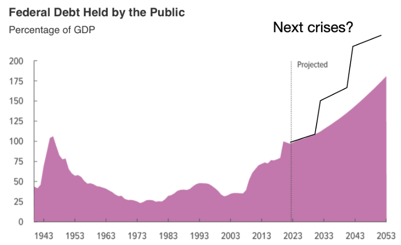 Figure 11. Congressional Budget Office long-term projections. Black lines are author art illustrating what may happen in future crises.