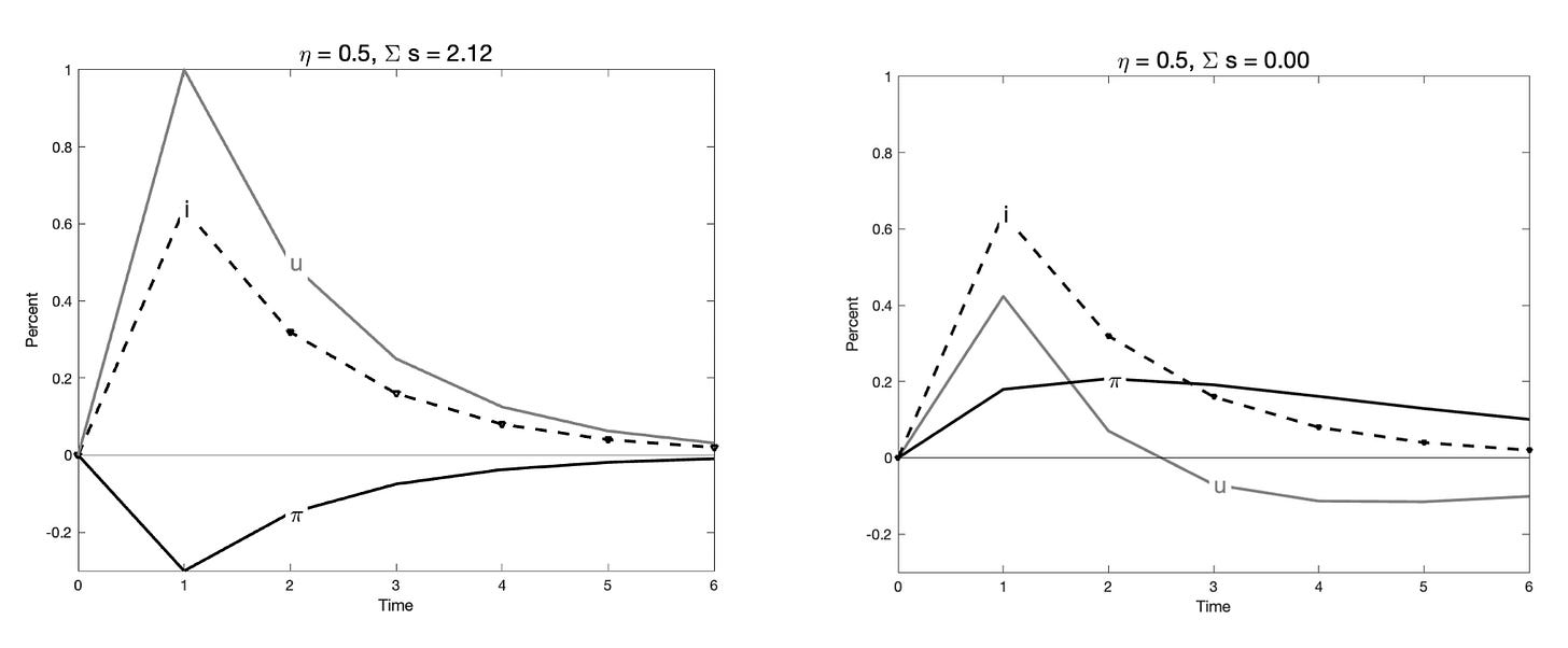 What can monetary policy do without fiscal help? The right-hand panel answers this question. In this model there are multiple disturbance paths that produce the same interest rate path . I reverse-engineer a different disturbance path that produces the same AR(1)-shaped interest-rate path as in the left-hand panel, but requires no increased fiscal surpluses from the “passive” fiscal policy—no lump-sum taxes, please. So, by construction, the path of observed interest rates is the same in the left- and right-hand panels.