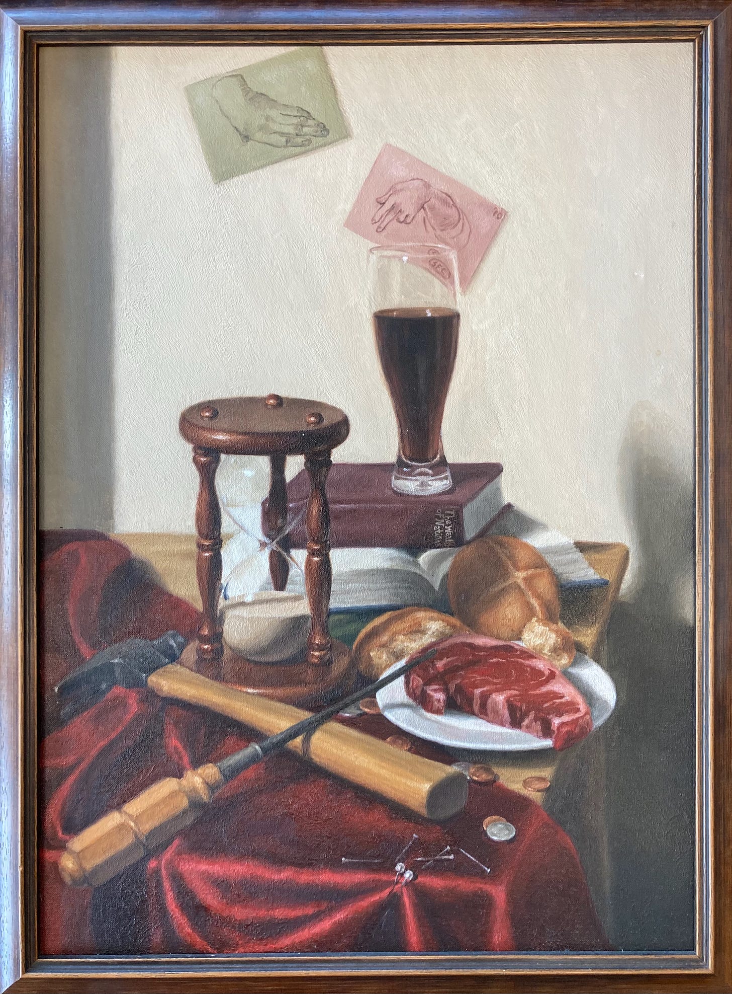 The painting is a gift from my daughter Sally when she was in high school. (She has gone on to become a supremely accomplished artist IMHO.) Find the allusion to the butcher, baker, brewer, invisible hand, pin factory, and a subtle foreshadowing of trouble in the arrangement of the tools.