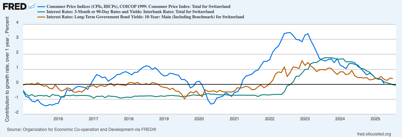 Swiss inflation barely exceeded 3% in the post-pandemic surge, and is back to zero. Interest rates are also back to zero.