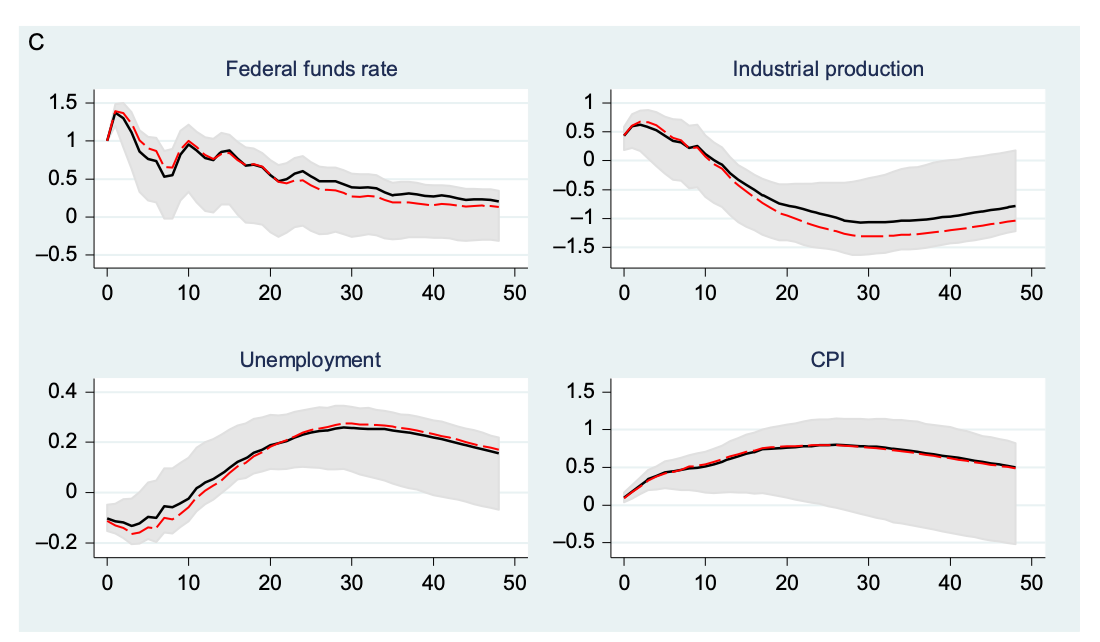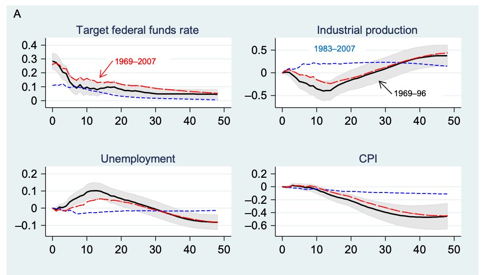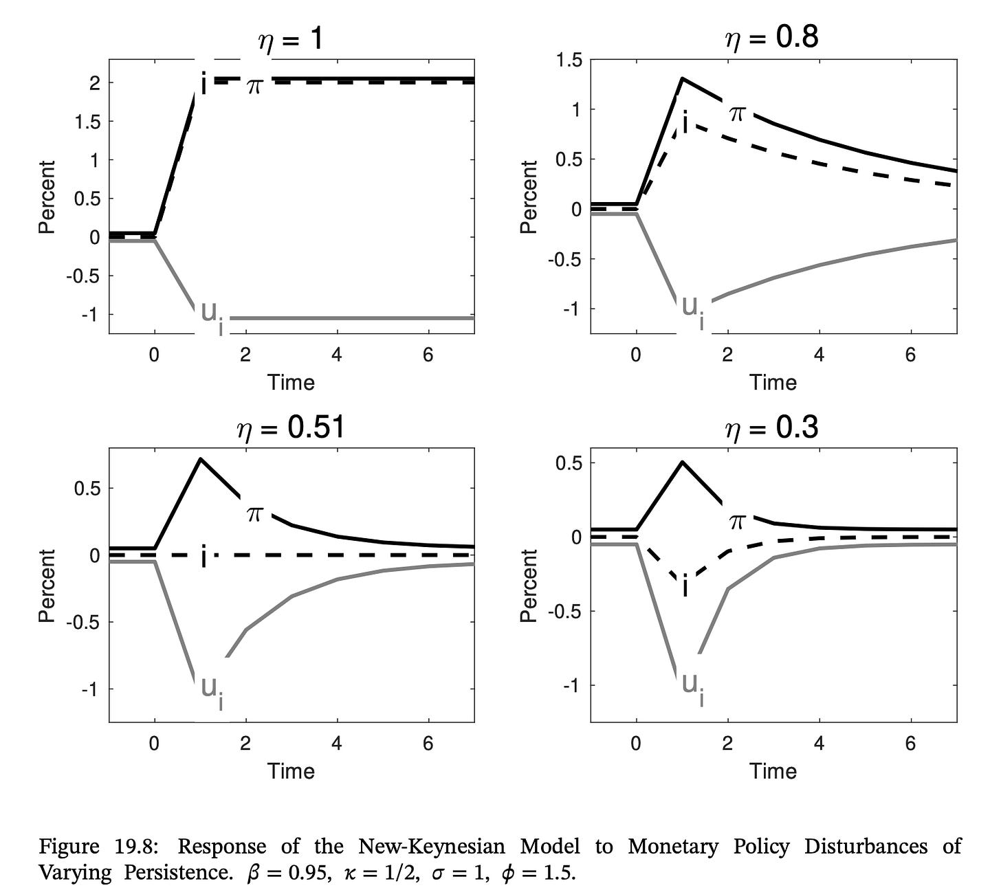 But what if the shock is more permanent? The top left panel gives the ultimate case: a permanent rise in the interest rate leads to an immediate and permanent rise in inflation! And, contrariwise, a permanent decline in the interest rate leads to a permanent decline in inflation!