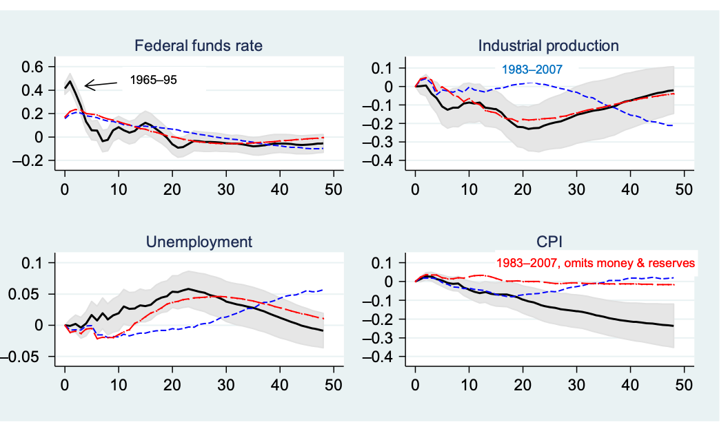 Here’s some standard empirical estimates from Valerie Ramey’s splendid review. Each of these plots the reaction of the level of the CPI (not the growth rate) to the indicated federal funds shock.