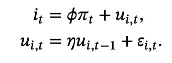 The top right shows a persistent but not permanent interest rate movement, which still pushes inflation in the same direction. The lower left panel shows how a shock with just the right persistence can implement an open mouth operation: inflation changes with no movement of interest rates at all. I left this out of the Op-Ed as nobody in the real world would believe that current models permit such a thing, but they do. The new-Keynesian model is about equilibrium selection, not about interest rates. But I digress.